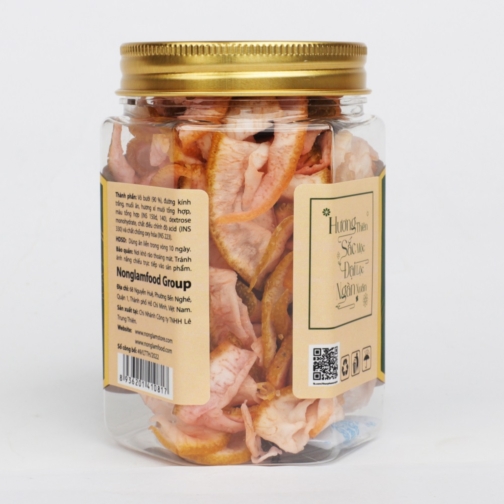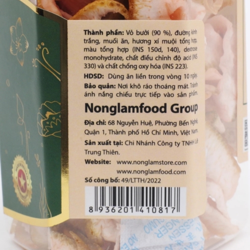 6. Thành phần: Vỏ bưởi (90%), đường kính trắng, muối ăn, dextrose monohydrate, chất điều chỉnh độ acid (INS 330, hương xí muội (hương thực phẩm tổng hợp), màu thực phẩm (INS 150d, 140), và chất chống oxy hóa (INS 223).