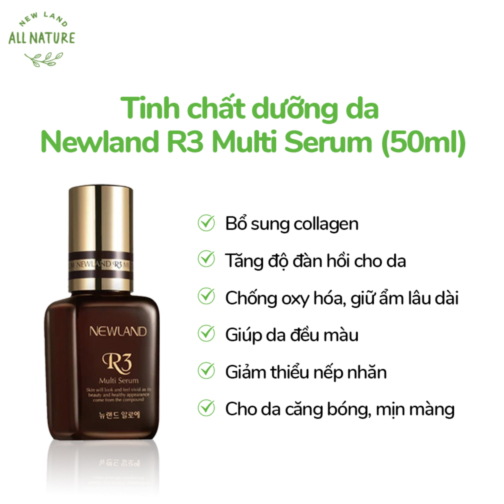 Tinh chất hỗ trợ phục hồi dưỡng da Newland R3 Multi Serum giúp dưỡng da, dưỡng sáng, giữ ẩm và cải thiện nếp nhăn cho làn da thêm sức sống. Công nghệ Radi-scavenger được cấp bằng sáng chế cho phép chống oxy hóa, nuôi dưỡng và thay đổi màu da đáng ngạc nhiên.