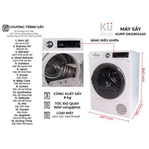 15 chương trình sấy. Với 7 chức năng tăng cường tương ứng với 27 lựa chọn tuỳ biến. Đáp ứng mọi nhu yêu cầu về sấy quần áo.
